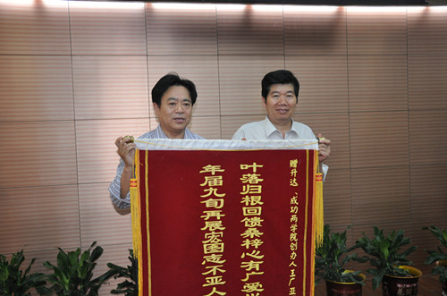 接着,商丘回族中学韩道平校长致感谢词。韩校长对学院热情的接待和提供的帮助表示衷心的感谢,对创办人的办学理念表示高度的认同,对学院的良好声誉和快速发展表示由衷的钦佩。韩校长说,成功学院创办人王广亚博士一生创办了十所不同层次的学校,办学成就蜚声海内外,积累了丰富的办学经验,其办学理念、办学精神、办学原则、管理特色对于指导学校的发展具有指导意义,通过深入研读创办人的相关著作受益匪浅。韩校长指出,高中和大学的根本任务都是培育人才,大学教育是高中教育的接力,是培养具有创新精神和实践能力的高级复合型人才。因此,大学里的一些先进的理念和科学的管理制度可以为高中教育所借鉴。正是基于此,经学校领导班子集体研究决定,校领导班子集体来成功学院驻校进行为期一周的学习交流,深入学习创办人的办学理念和成功学院的先进管理办法,以推动商丘回族中学实现更好的发展。韩校长要求学习交流成员要有学习笔记、要深入到对口部门、要有学习总结,不走过场,注重实效,通过学习交流真正取到“真经”。韩校长以赠给创办人和学院的锦旗内容为感谢词的结尾,以表对创办人的敬佩之情和对学院的好感之意。赠给创办人的锦旗内容为:叶落归根回馈桑梓心有广爱兴业办校职位后辈升达,年届九旬再展宏图志不亚人严管慈教但求学子成功。赠给学院的锦旗内容为:教育的圣地,师生的乐园。