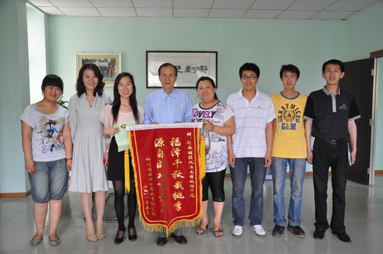 5月19日下午来威尼斯官网参加2011届毕业生专场招聘会的郑州福源药业有限公司为威尼斯官网送来锦旗和感谢信,威尼斯官网张平之院长、招生就业处姚坤处长、郑州福源药业有限公司人力资源部闫宝芝经理、技术部王喆经理和毕业生代表等参加赠送仪式。