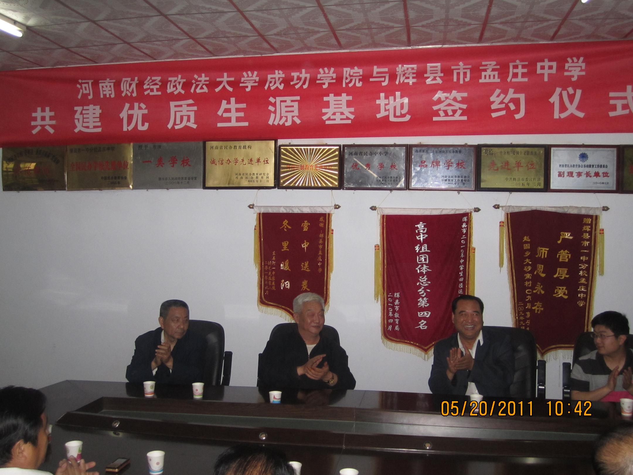 2011年5月20日上午,河南财经政法大学成功学院与河南省辉县市孟庄中学为共建优质生源基地挂牌仪式在辉县市孟庄中学隆重举行。