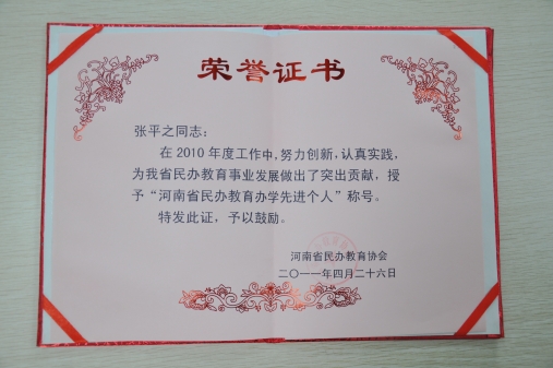 张平之院长被授予“河南省民办教育办学先进个人”荣誉称号