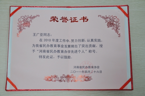 创办人王广亚博士被授予“河南省民办教育办学先进个人”荣誉称号