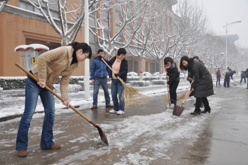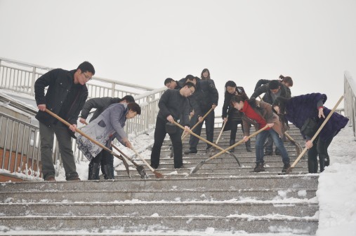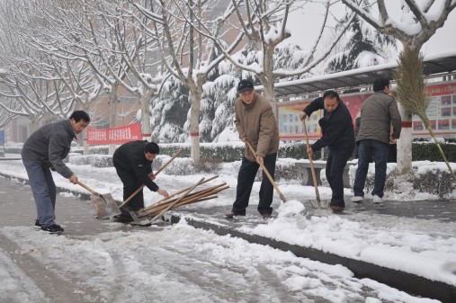 突如其来的大雪,使得学院路面积雪并结冰,给广大师生带来了诸多不便。为尽快消除道路积雪结冰给师生们工作生活造成的影响,确保师生在校的交通安全,张平之院长于3月1日一早就要求立即对学院几个重点部位:校门口、成功大道、食堂大门口、体育馆大门口、宿舍大门口、教学区大门口进行扫雪铲冰行动。在张院长的指示下,各单位人员立即行动起来,在学院各个主干道路按照学院分配好的区域进行作业。大家有的用铁锹铲去地面的积雪,有的用扫帚扫,甚至有的直接用垃圾斗铲积雪,干的热火朝天。临近上午十点,各位同仁高质量地完成了扫雪任务,为师生的活动和出行安全提供了有力的保证。