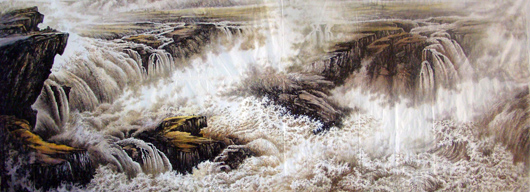 《黄河之水天上来》大型山水画是艺术系为威尼斯官网7周年校庆献上的一份厚礼,此画表达了艺术系师生对学院的真挚祝福。此画的主题内容为中国黄河壶口瀑布,壶口瀑布是中国黄河上的著名瀑布,其奔腾汹涌、生生不息的气势已成为中华民族精神的象征。画中描绘的壶口瀑布气势磅礴、排山倒海,站到画作之前,令人如身临其境,仿佛能听到震天的涛声,让人感受到中华民族强烈的自强不息、勇往直前的民族精神,画面雄强的气势感染着在场的每一位观众,使人仿佛也看到了成功学院涌动着的蒸蒸日上、自强不息的强大内在力量!