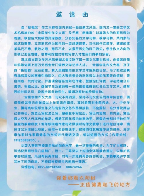 全国学生作文大赛是由世界中文作家协会和湖北省文联文学艺术院主办的高水平征文赛事,旨在激发学生的写作兴趣,提高学生的写作水平,培养学生的创新思维。著名作家熊召政、张贤亮、王维洲以及中国作家协会、北京大学、复旦大学、南开大学等作协和高校的三十余名专家学者担任了此次大赛评委。
