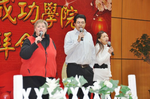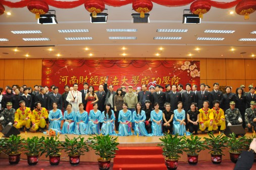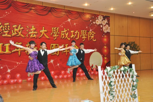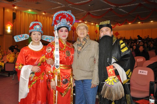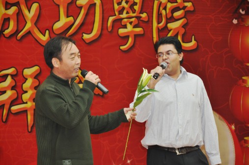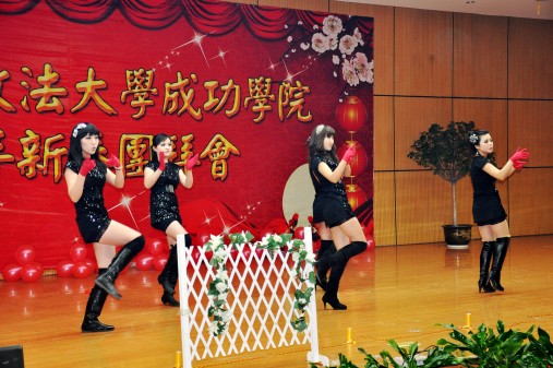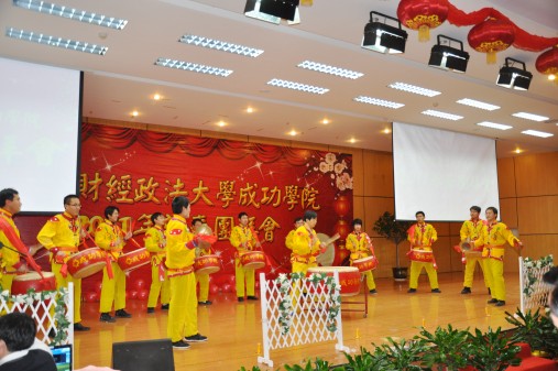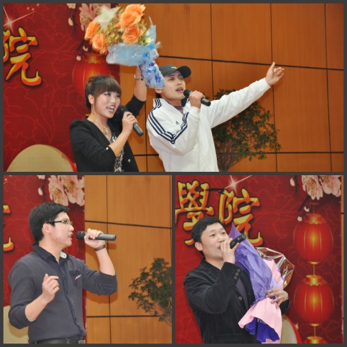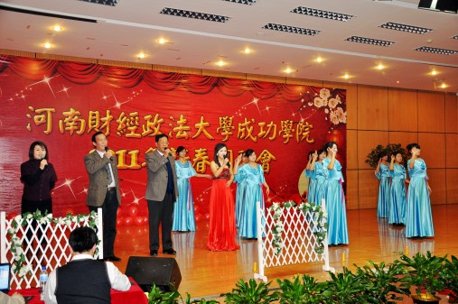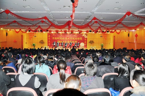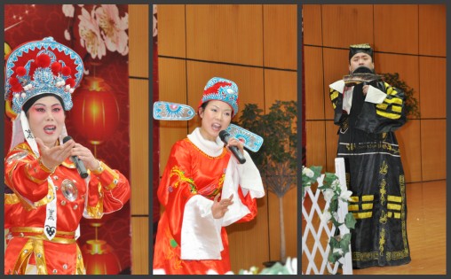 接下来,丰富多彩的文艺节目使现场气氛跌宕起伏。院教工盘鼓队的激情表演拉开了演出的序幕。舞蹈《Nobody》以活力十足、魅力四射的表演赢得了大家的阵阵掌声;保卫科的队列表演步伐整齐,庄严伟岸;商学系老师们的手语表演《隐形的翅膀》以欢快的歌声,翩跹的舞步,赢得了观众的阵阵喝彩;雷人舞蹈《花样年华》表演,节奏欢快,刚劲火爆;歌曲串烧以变幻的歌声和精彩的表演,给大家带来一种愉悦的享受;在欢快的乐声中,交谊舞表演以曼妙的舞姿,点亮青春和谐的音符;中外友人合作演绎的中文歌曲《朋友》,真挚动听,让人感受到共叙友谊的温暖和喜迎新年的气氛。在整个表演中,戏曲联唱也是一大亮点。经典曲剧《用巧计哄元帅》、《谁料皇榜中状元》和《四千岁》在观众的欢呼声中依次登场,优美的表演、圆润的唱腔再次点燃了观众的激情。创办人也喜不自禁,兴致勃勃地登台与演员合影,并赠送红包,表达鼓励和祝福。随后,由院领导和一级主管代表演唱的《明天会更好》以激情澎湃、热烈恢弘的歌声寄托着辞旧迎新的新年祝愿,把演出推向高潮。