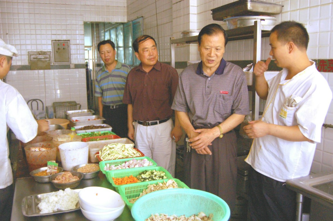 6月25日中午,烈日当空,热浪袭人,张平之院长、赵亚宏副院长在伙食科郭海科长等人的陪同下,冒着酷暑深入四希饭庄、商业街和教工餐厅,检查指导防暑工作。