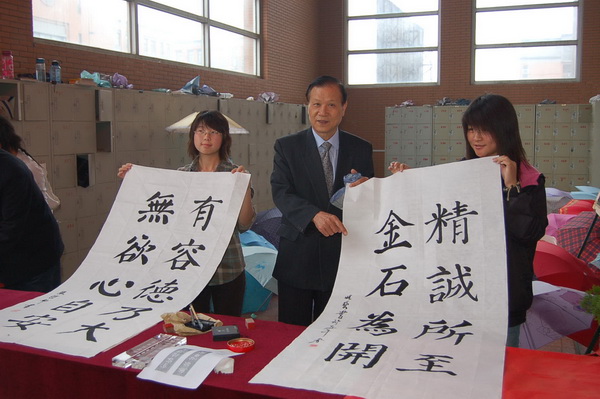 展览吸引了不少同学前来欣赏,他们有的在字画前仔细地品读回味,有的三五成群地在创办人的写真背景下合影留念,不时的用手机拍下这些书法作品,用来激励自己。