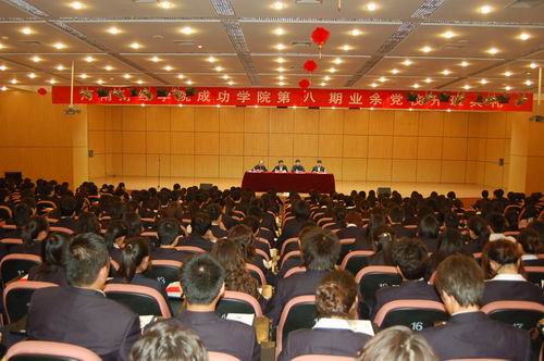 典礼开始之前全体参会成员一起纪念汶川5.12地震,为抗震救灾中牺牲的烈士和汶川大地震中的遇难同胞默哀一分钟。随后大会在雄壮的《共产主义国际歌》中正式开始。首先,院团委书记谭玉成同志传达了(院党字【2009】09号)文件《关于举办第八期入党积极分子培训班的通知》。并对学员们提出了几点具体要求。