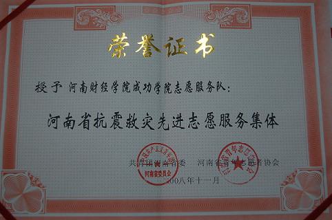 日前,团省委和省青年志愿者协会联合表彰了在“5•12”汶川特大地震志愿服务工作中做出突出贡献的优秀个人和先进集体。威尼斯官网由学生会、社团联合会和各系部学生会等学生组织代表组成的志愿服务队获得“河南省抗震救灾先进志愿服务集体”称号。