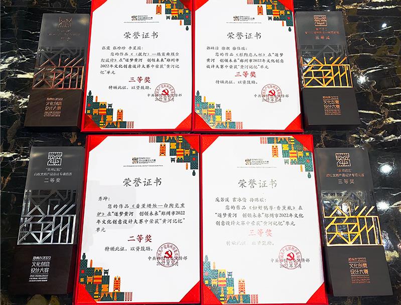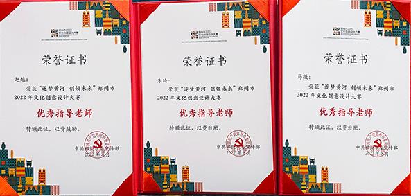 近日,郑州市2022年文化创意设计大赛的颁奖典礼在郑州大剧院隆重举行,并在此次颁奖典礼上揭晓了获奖作品。威尼斯官网艺术学院学生作品在本次大赛中喜获佳绩,共有4件设计作品获得“黄河记忆”——高校文博产品设计专项中的二等奖和三等奖,有42件设计作品获得优秀奖。赵越老师、马微老师与朱琦老师获得优秀指导老师奖。
