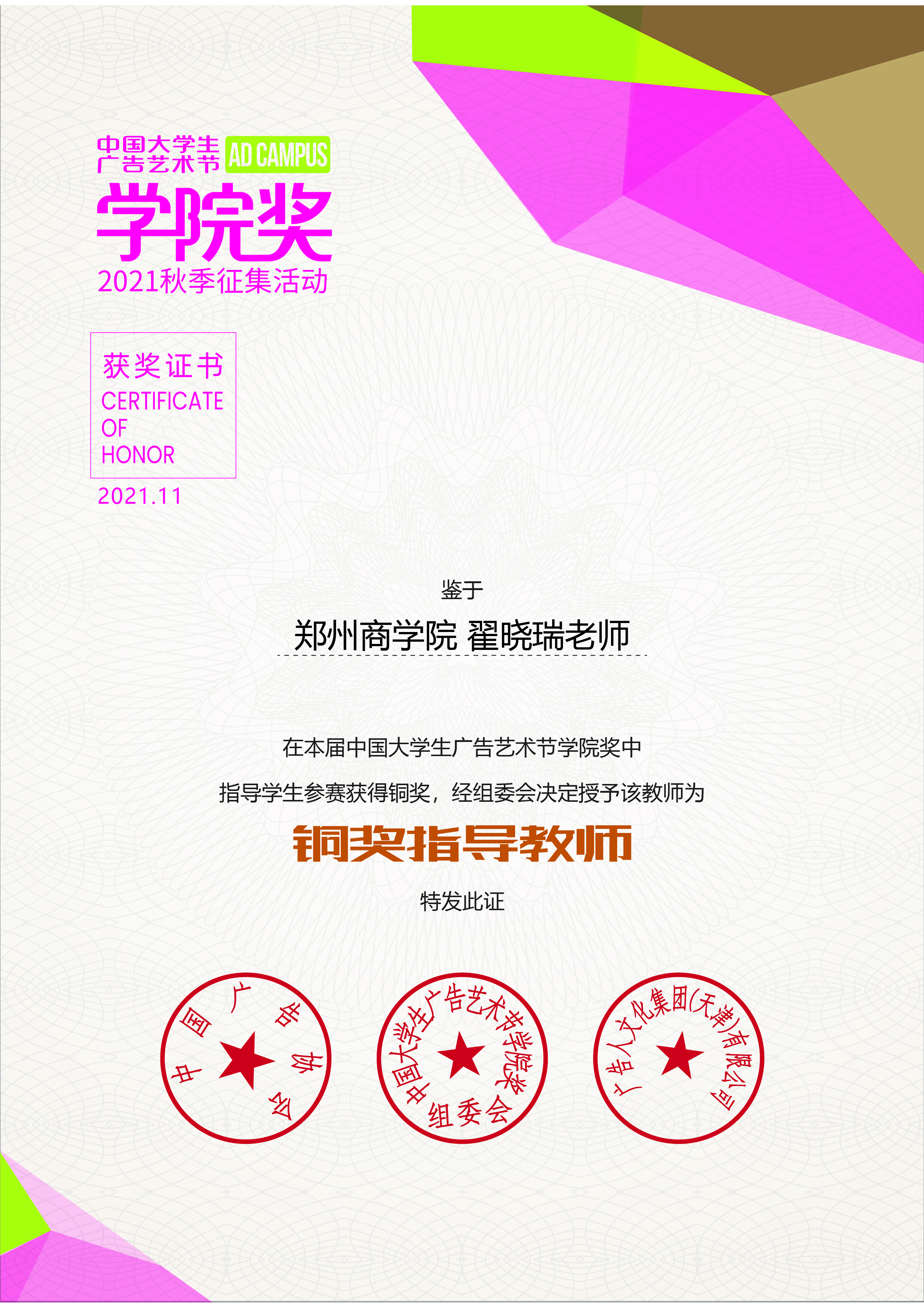 翟晓瑞老师荣获“铜奖指导教师”证书