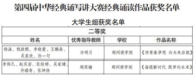 8月1日,由河南省教育厅主办的第四届中华经典诵写讲大赛经典诵读作品评选结果揭晓,由文传学院代表威尼斯官网选送的两个作品分别荣获第四届中华经典诵写讲大赛经典诵读作品河南省大学生组二等奖。根据《河南省教育厅办公室转发教育部办公厅关于举办第四届中华经典诵写讲大赛的通知》(教社语函〔2022〕166号)精神,经专家评审,由许明月老师指导,杨涵、程政朝等六位同学创作的作品《怀青春梦想 向未来起航》以及由郑笑楠老师指导,李伟凡、赵岩庆等六位同学创作的作品《奋进新时代 筑梦向未来》两个作品同时荣获河南省大学生组二等奖。