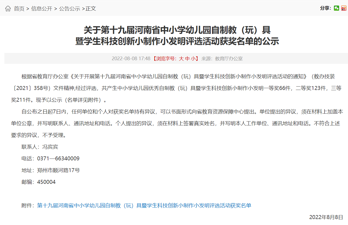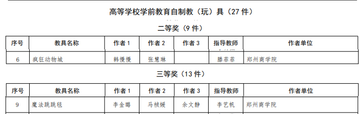 8月8日,由河南省教育厅主办的第十九届河南省中小学幼儿园自制教(玩)具暨学生科技创新小制作小发明评选活动评选结果揭晓,由文传学院选送的两个作品《疯狂动物城》《魔法跳跳毯》分别荣获高等学校学前教育自制教(玩)具二等奖、三等奖。根据省教育厅办公室《关于开展第十九届河南省中小学幼儿园自制教(玩)具暨学生科技创新小制作小发明评选活动的通知》(教办技装〔2021〕358号)文件精神,文传学院高度重视本次比赛,自下发文件起积极组织学生参与,组织初选,并层层选拔。经过评审,最终确定由滕菲菲老师指导,韩慢慢、张慧琳制作的《疯狂动物城》,由李艺帆老师指导,李金璐、马祯媛、余文静制作的《魔法跳跳毯》参加比赛。在制作过程中,通过邀请幼儿体验玩教具的使用过程,发现教具设计的问题并加以补充完善,精心录制教具使用视频,最终参加评选。