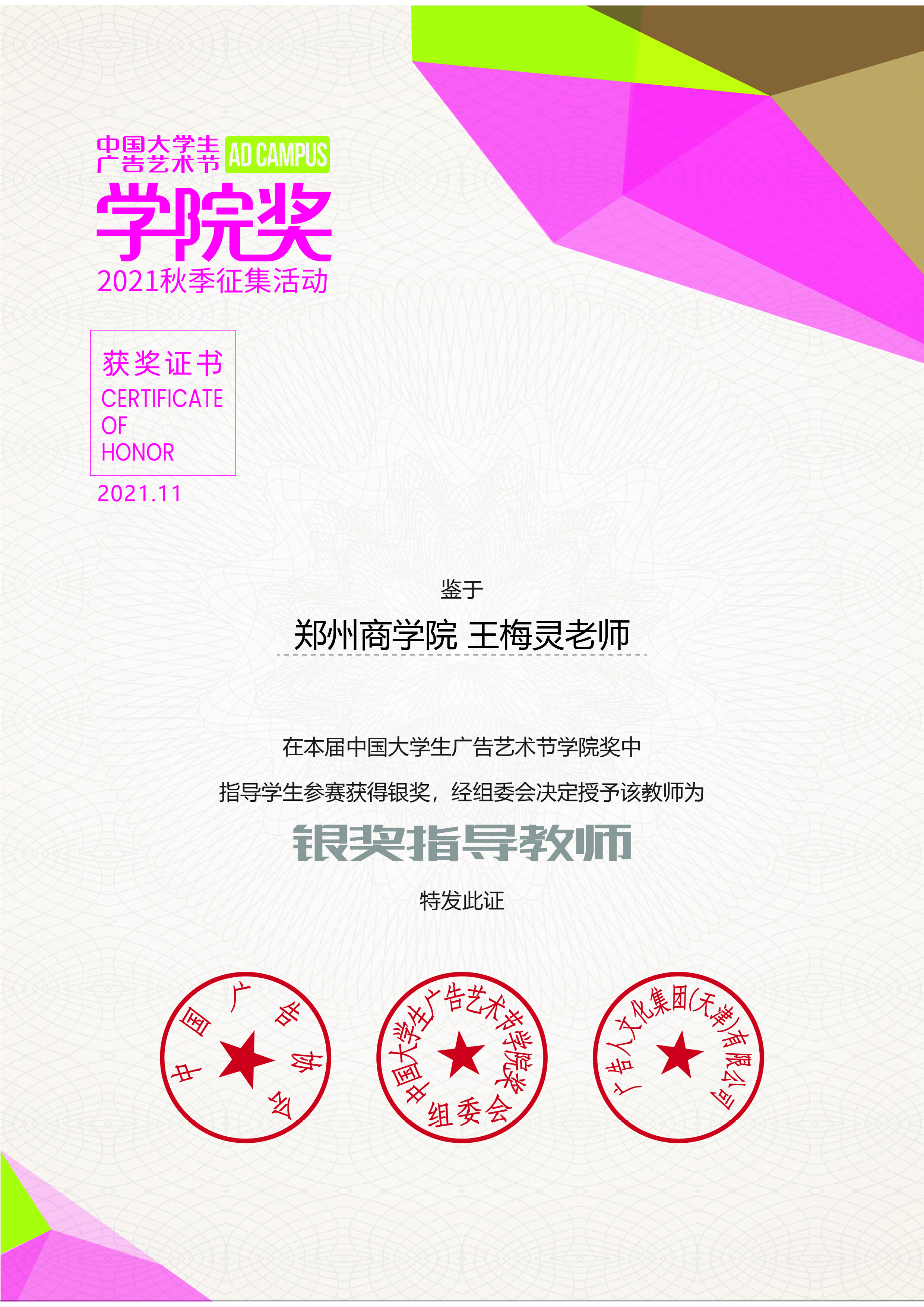 王梅灵老师荣获“银奖指导教师”证书。