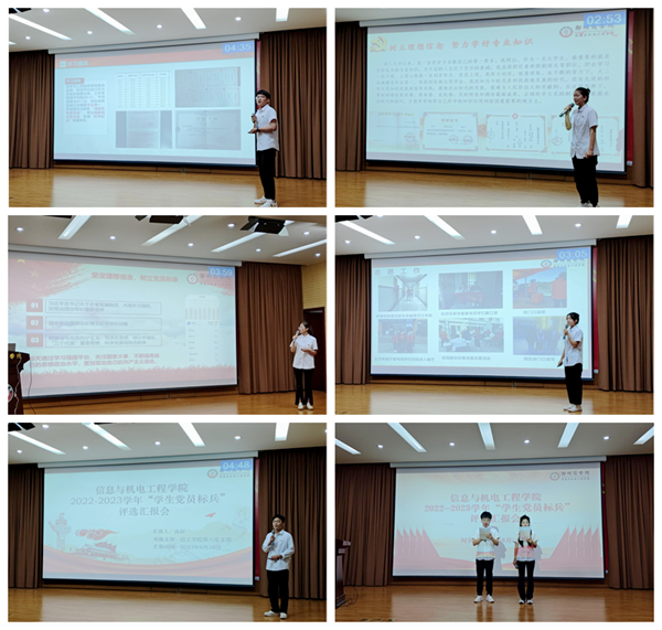 为深入学习贯彻党的二十大精神,扎实推进主题教育,进一步增强团队凝聚力、向心力和战斗力,激励引导广大师生坚定不移听党话、跟党走,坚定信心、奋勇争先,落实日常考评和年终考核程序,促进支部、党员之间的交流,创新工作开展思路,营造争先创优的良好氛围,信工学院于6月26日晚在图书馆五楼报告厅2022-2023学年“学生党员标兵”评选汇报会。信工学院党委书记周余、各学生党支部书记、全体辅导员老师以及全体在校学生党员。