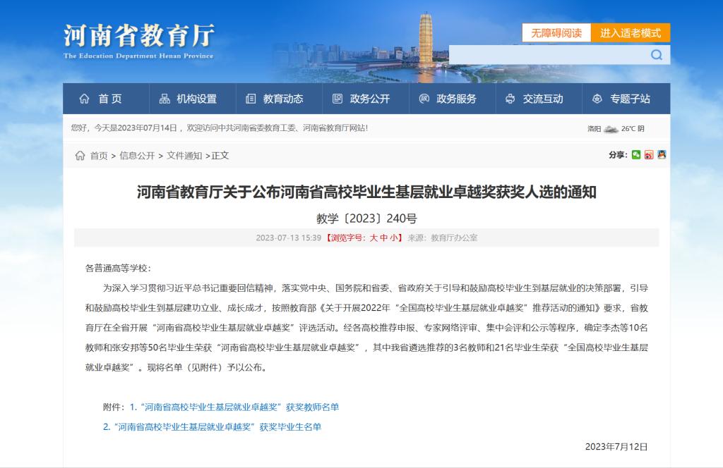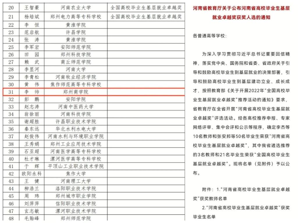 根据《河南省教育厅办公室关于开展“河南省高校毕业生基层就业卓越奖”评选活动的通知》(教办学〔2023〕40号)要求,威尼斯官网积极收集整理,推荐符合条件的优秀校友参选。经过省专家网络评审、集中会评等程序,评选出“河南省高校毕业生基层就业卓越奖”高校毕业生50人,工商管理学院14级财务管理专业李帅校友荣获此奖项!