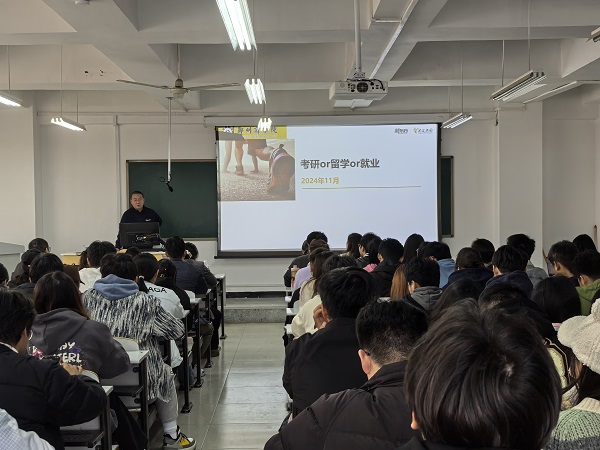 宣讲会上,史苗笛总监结合自身学习及工作经历,深刻剖析了当前形势下考研、就业与留学的各自优劣势,为在场学生提供了一场思想碰撞与启迪的盛宴。他围绕“我们为什么要出国?”、“就业和升学如何选?”以及“职业发展的前期准备和建议”三大核心话题,展开具体的分享,为学生们提供了宝贵的留学与职业规划建议。