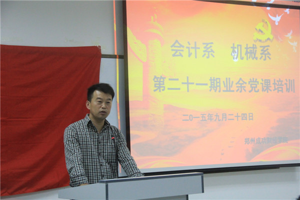 会上,会计系党总支书记马锋做了重要讲话。他鼓励和支持更多优秀的同学加入党组织,并告诉在座听党课的同学们努力学习,严格要求自己,珍惜党课培训并学以致用,为以后进入社会打下坚实的思想道德基础,积极响应党的号召,与时俱进,更好地发展自己。他希望同学们思考“两个问题”,即党和军队力量的来源以及入党动机是否端正;把握“两个重点”,即把握学习的重点和理论联系实际的学习方法;做好“三个表率”,即学习上、务实服务上、创新上的表率。