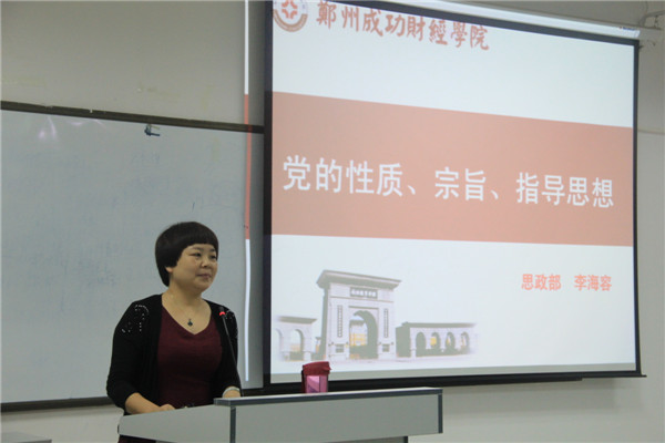 开班仪式结束,由思政部的李海容老师为大家讲授第一课--《党的性质、宗旨、指导思想》。她从中国共产党诞生的背景切入主题,以党的十八次全国代表大会为线索讲述了中国共产党曲折中探索进步的发展历程。