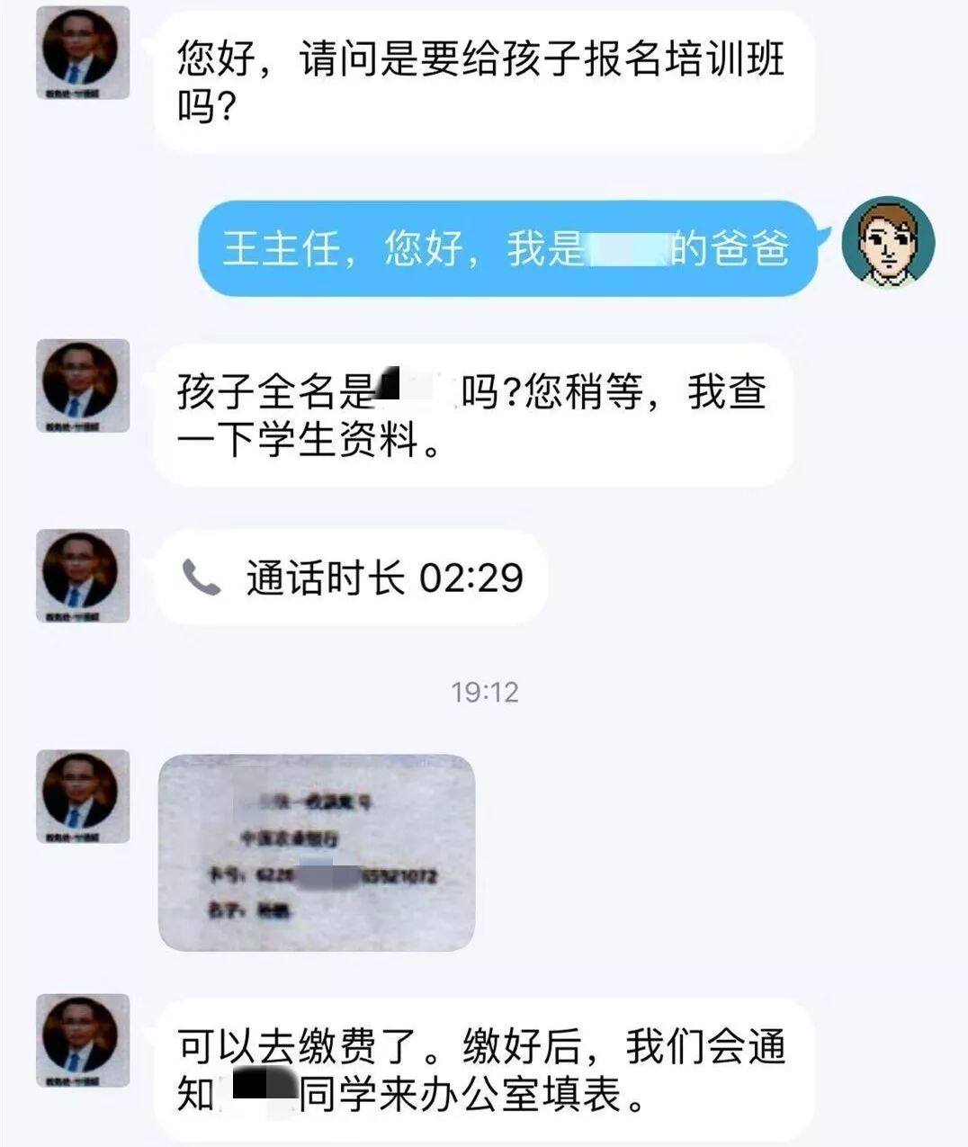 尚且犹豫不定的家长与“老师”联系后,“老师”则会准确报出孩子的姓名和各种信息,让家长深信不疑后转账汇款。