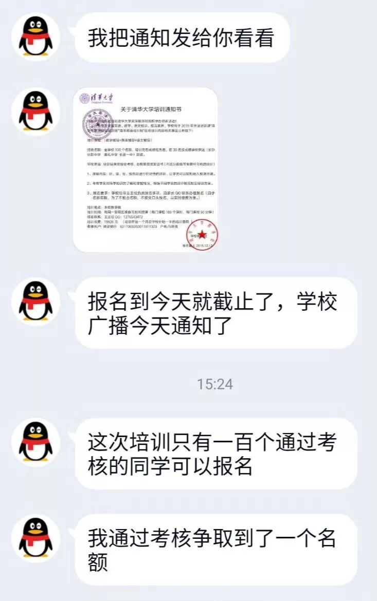 而他有一件重要的事情要与家长商量。接着发来了一张《清华大学培训通知书》。