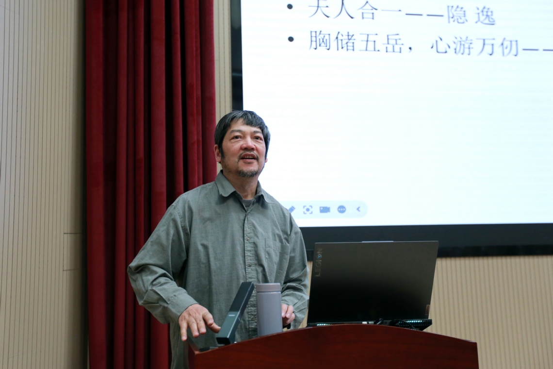 在讲座中,邬建教授从山水画与中国文化的深厚渊源切入,阐释了山岳崇拜、天人合一等文化内涵,指出山水画在文人精神追求中的重要作用,并结合“绿水青山就是金山银山”的理念,呼吁尊重自然、保护自然。