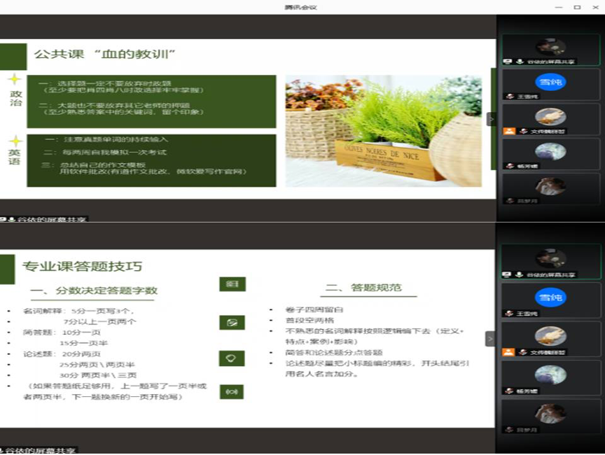 读研校友根据当前考研实情,结合自身考研经历,为必考科目政治、英语及专业课的复习提供了宝贵的备考经验,同时对考前学生的不安情绪进行了疏导,减轻了考研学生的心理压力。