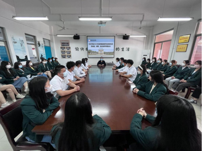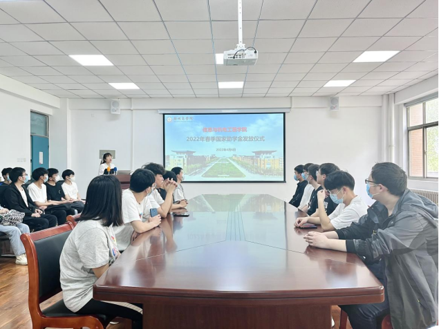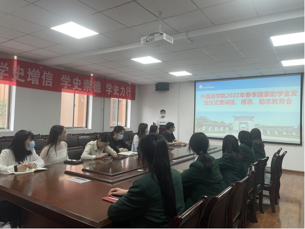 根据学务处统一部署,外语学院于4月11日下午在W209会议室组织召开“2022年春季国家助学金发放仪式暨诚信、感恩、励志”教育会。本次会议由资助专员丁震霆老师主持,学院团委书记张文娟、全体辅导员以及助学金获得者代表参会。