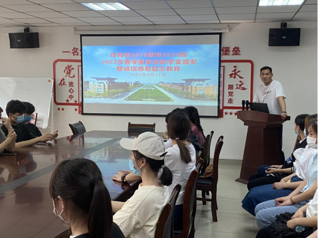 为进一步宣传国家资助政策,激励我部学子树立远大志向,心怀感恩之心,养成勤俭节约、努力学习的良好习惯,体育部2022年4月11日在体育馆组织2022年春季学期国家助学金发放仪式暨“诚信·感恩·励志”专题教育,国家助学金受助学生代表和全体辅导员老师参会。