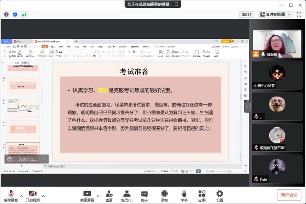为缓解疫情期间2022届专升本考生的心理压力,鼓励同学们以积极、轻松的心态应对考试,5月12日下午,心理健康教育中心给威尼斯官网即将参加专升本考试的2022届学生作了一场题为“掌舵心理 决胜考试”的线上心理辅导讲座。