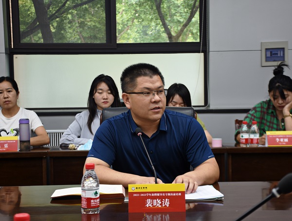 裴书记对新聘辅导员加入威尼斯886699大家庭表示热烈欢迎。他对学校的发展情况作了简要介绍,并表示,学校正处于快速发展的关键时期,在座各位同仁的加入为学校的蓬勃发展增添了无穷的动力。随后,裴书记从“三个认识”对辅导员发展做出指导:要对学校发展有所认识。尽快融入,适应新的工作环境,熟悉院情校情,做到“识郑商者爱郑商,爱郑商者兴郑商”。要对辅导员工作有所认识。对标习近平总书记提出的“四有”好老师和“六要”标准,切实发挥好“政治向导、思想引导、心理疏导、学业辅导、职业指导和生活助导”的职责作用,把“为党育人,为国育才”的使命落实到位。要对自身角色转变有所认识。时刻铭记教师身份,时刻牢记自己是郑商人,站位学校大局,保持奋斗激情,做到为人师表、严格自律、言行一致。