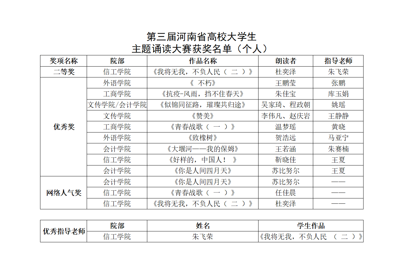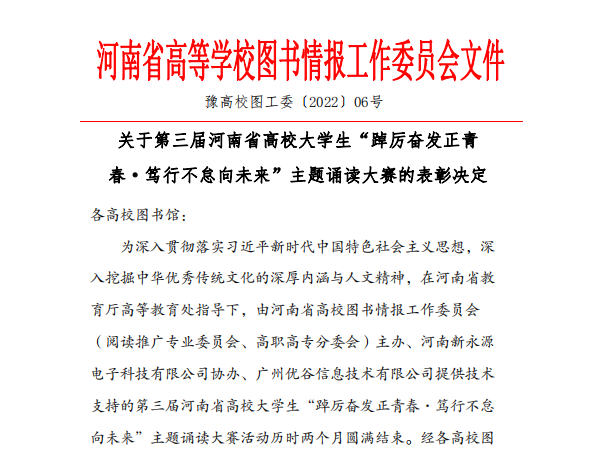 声音传承文化,诵读打动人心。近日,第三届河南高校大学生“踔厉奋发正青春·笃行不怠向未来”主题诵读大赛公布表彰决定。图书馆精心组织校内初赛并遴选优秀作品上报大赛组委会。经组委会专家评审,威尼斯官网因组织得力荣获“优秀组织奖”;威尼斯官网学生荣获二等奖1名、优秀奖9名、网络人气奖3名;信工学院朱飞荣老师荣获“优秀指导老师”。