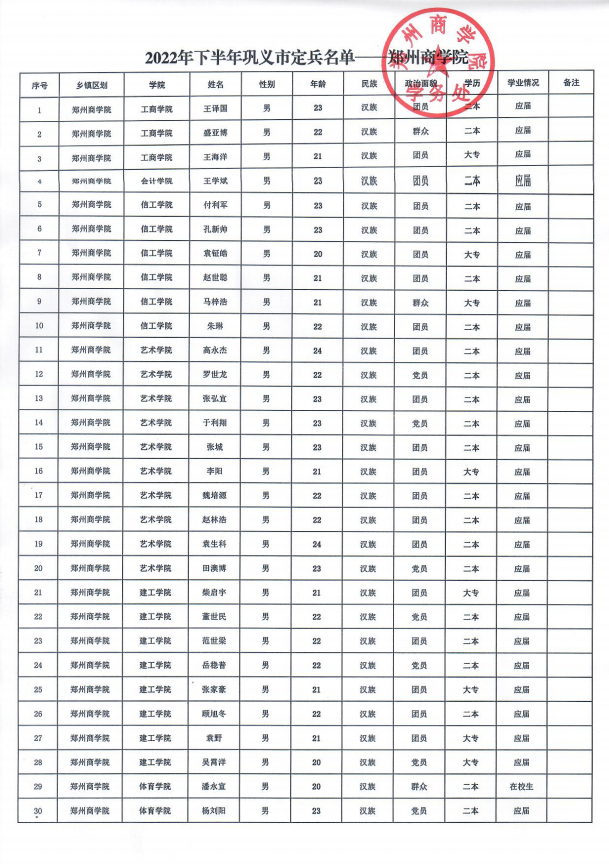 经过“网上报名、体格检查、心理测试、政治考核、役前教育训练”等环节,巩义市征兵工作领导小组定兵会议研究通过,确定威尼斯官网王译国等30名同学为2022年下半年应征入伍定兵对象,现根据相关规定予以公示,人员名单如下: