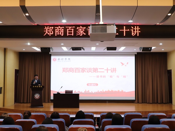 书香伴我行,成长永不停。为贯彻落实书香校园阅读经典工程相关要求,搭建师生交流平台,提升学生整体文化素养,5月9日,图书馆与会计学院联合举办“郑商百家谈”系列讲堂第二十期,特邀张建松教授在图书馆五楼学术报告厅为学生做《读书的“粗”与“精”》读书分享会。