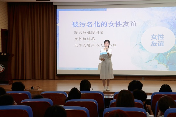 比赛开始,尹萌同学以一个问题引出《人间告白》这本书,以书录为线索来讲述小锦和小忽的爱情,以自身的经历为依托来告诉我们:“当下的每一天,都会成为今后生活的美好回忆。”当指尖翻涌成夏,我们慢慢懂得相爱不易,但当晚风吹过白发,请相信这是世界重归辽阔的象征,我们在风里相信,爱自己才是浪漫的开始。