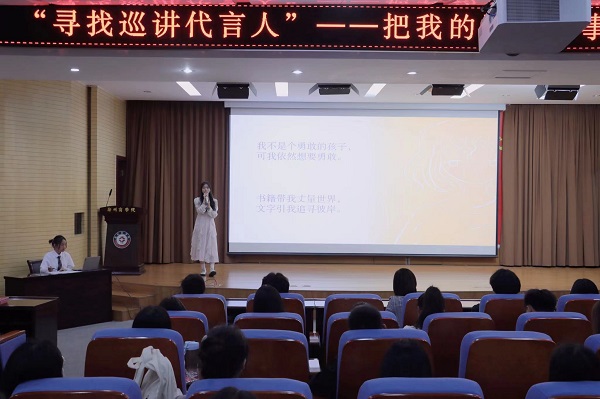 5月12日晚,由图书馆主办、郑商书友会协办的“寻找巡讲代言人”决赛在图书馆五楼报告厅成功举行。本次活动有四位巡讲人进行演讲,分别是来自会计学院21级会本2班的尹萌《人间告白》,金贸学院21级国贸2班的杨培博《我与地坛》,文传学院21级学教1班的赵宁丹《可是我偏偏不喜欢》,文传学院22级广告1班的吴兴羽《正是橙黄橘绿时》。