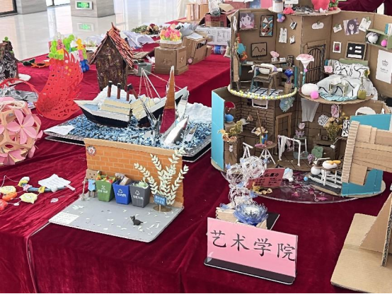 各二级学院积极响应,组织学生综合利用废弃纸箱、塑料袋、塑料瓶等制作手工作品,作品创作期间,郑商学子充分发挥自己丰富的想象力,以劳动和环保为主题,运用劳动工具、生活旧物以及劳动场地的树叶等素材制作成精美的手工作品。