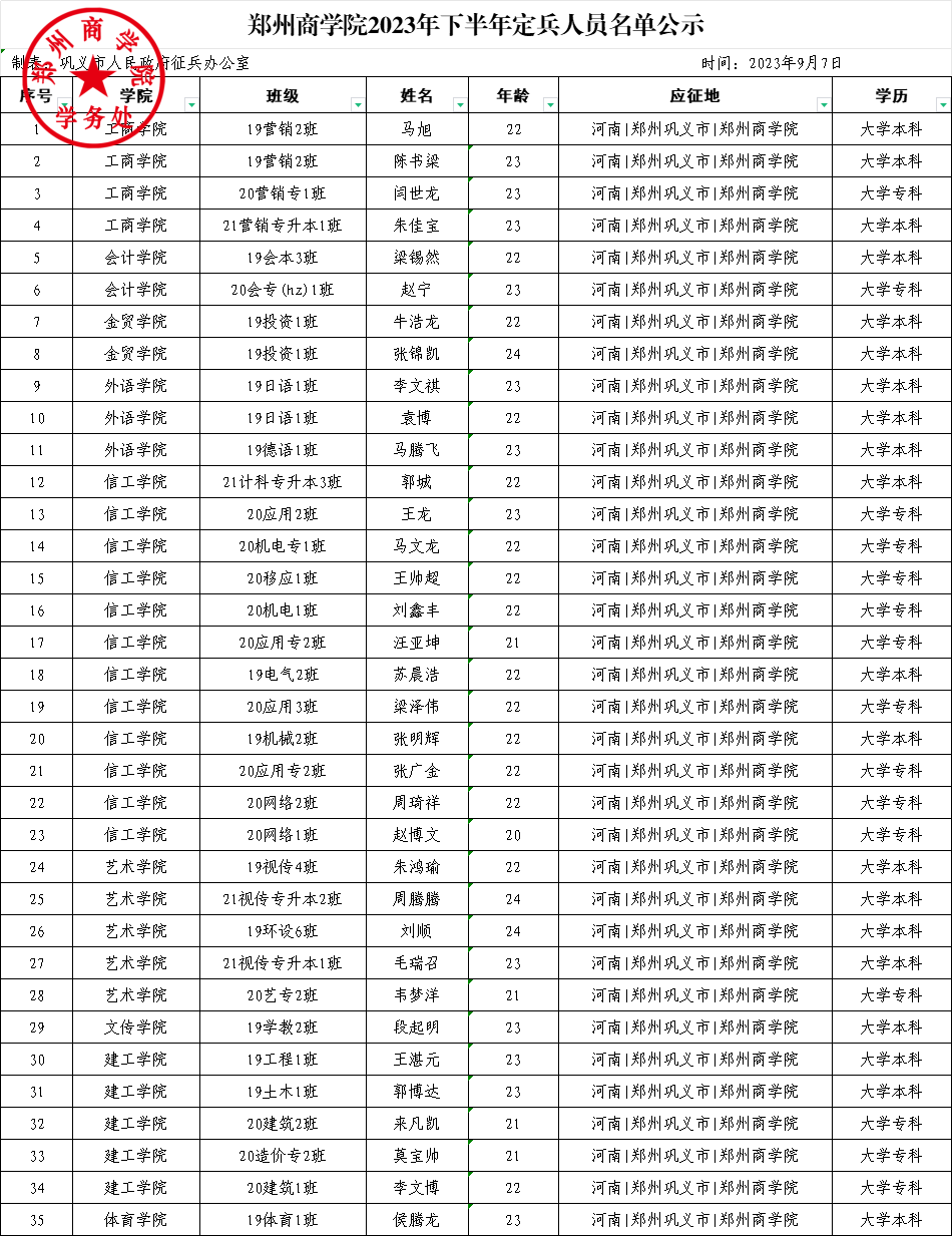 经过“网上报名、体格检查、心理测试、政治考核、役前教育”等环节,巩义市征兵工作领导小组定兵会议研究通过,确定威尼斯官网马旭等35名同学为2023年下半年应征入伍定兵对象,现根据相关规定予以公示,人员名单如下: