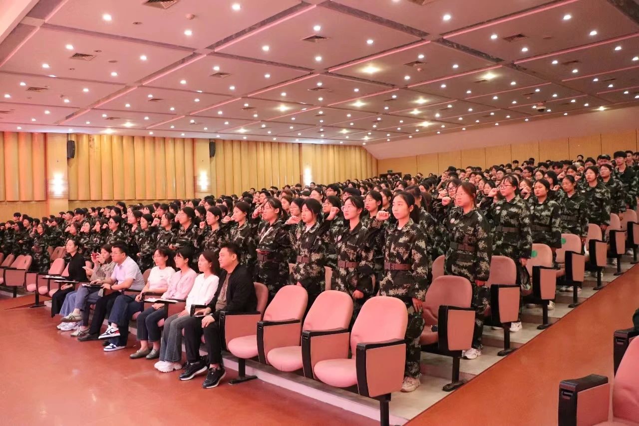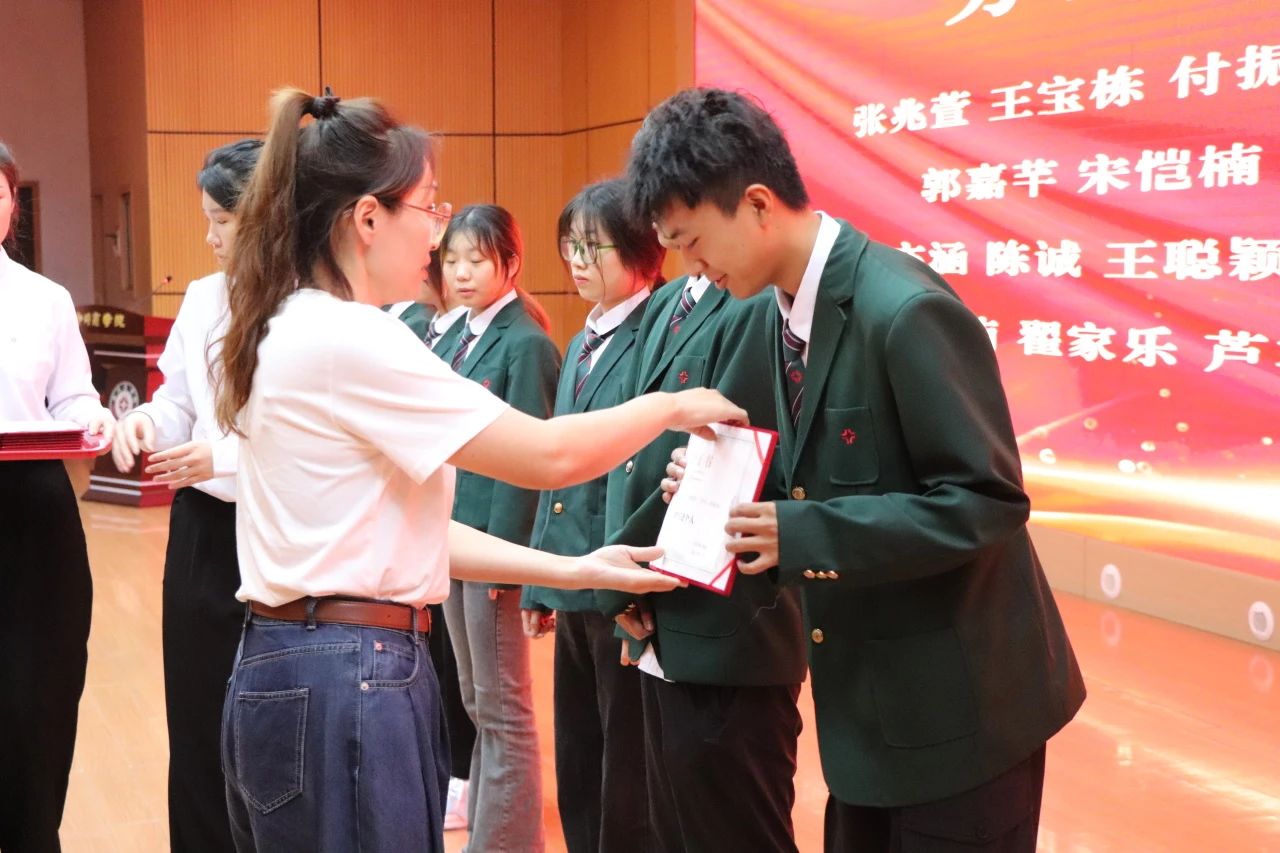 在学生代表发言结束后,学务处劳卫科科长贺萌为22级劳动小组长代表颁发聘书并合影留念,全体23级新生代表进行劳动教育宣誓,22级劳动小组长代表蔡铭钰同学领誓。