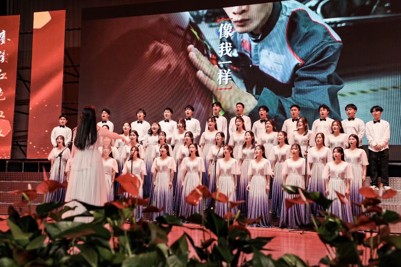 弦歌不辍,唱响百年辉煌;百年峥嵘,凝聚奋进力量。文传学院选送的《游击战歌》一上来激情澎湃,以深沉、激荡的红色旋律开启了大赛的第一篇章《峥嵘岁月传薪火》;外语学院带来的《在灿烂阳光下》道出共产党领导全国人民走过的风雨历程,沐浴着新时代灿烂阳光下的我们,应怀揣着心中信仰,肩负起青年一代的使命,共筑新时代新辉煌;校团委星空合唱团的《有我》将共青团100年的“伟大”与“平凡”唱成一首不朽的诗,以青春赴万丈理想,回溯着一代代不负时代重托的中国青年。