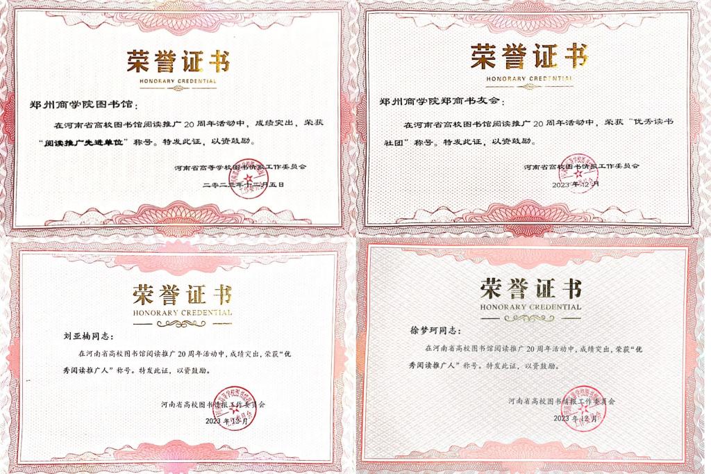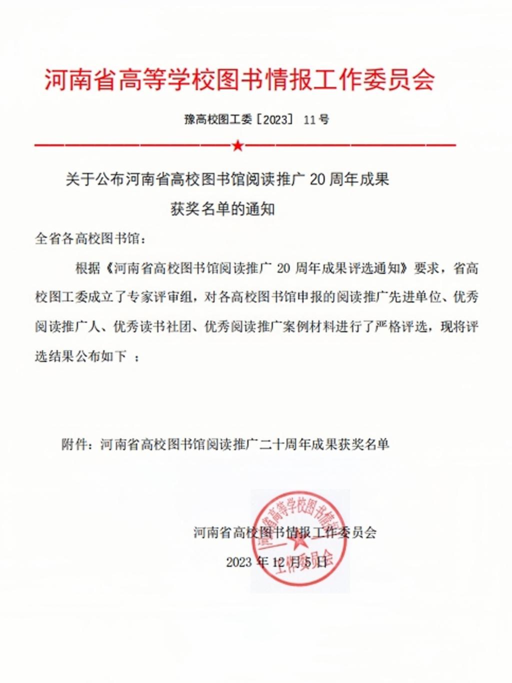 12月15日,由河南省高校图书情报工作委员会主办的河南省高校图书馆阅读推广20周年总结表彰大会在郑州大学图书馆成功举办。威尼斯官网图书馆荣获“河南省高校阅读推广先进单位”,书友会荣获“河南省高校图书馆阅读推广优秀读书社团”,刘亚楠、徐梦珂老师荣获“优秀阅读推广人”等称号。