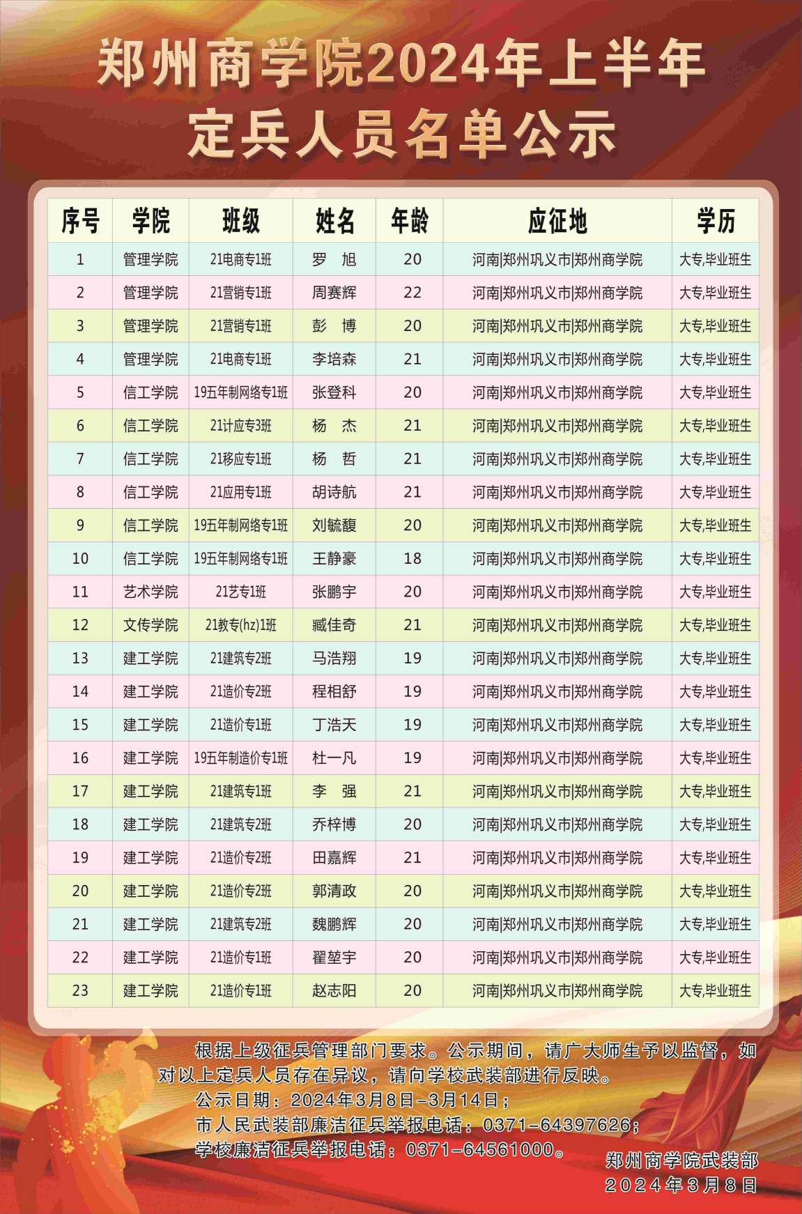 经过“网上报名、体格检查、心理测试、政治考核、役前教育”等环节,巩义市征兵工作领导小组定兵会议研究通过,确定威尼斯官网罗旭等23名学生为2024年上半年应征入伍定兵对象,现根据相关规定予以公示,人员名单如下: