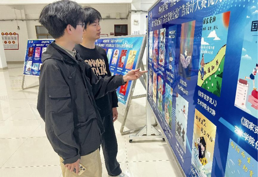 活动前期,各学院积极动员全体同学参加此次作品设计,并完成了活动初期的作品征集阶段。经过学院推荐、专家评审和校级评选等环节,最终推选出平面类优秀作品84件进行线下展览。作品一经展出,吸引了众多老师和学生驻足观看,有效扩大了活动宣传的覆盖面和影响力。