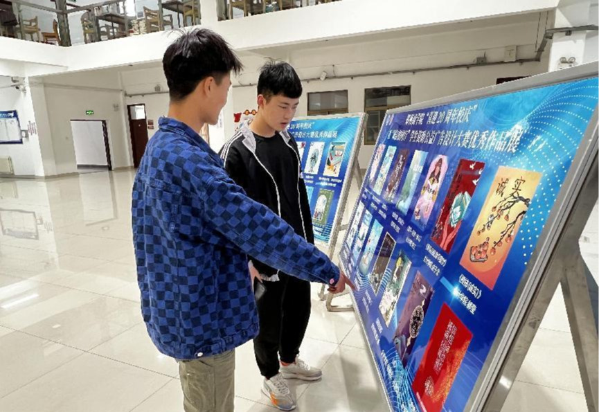 3月25日,学务处学生资助管理中心在自力楼一楼大厅进行“喜迎二十周年校庆”暨“诚信校园行”学生资助公益广告设计大赛优秀作品展。
