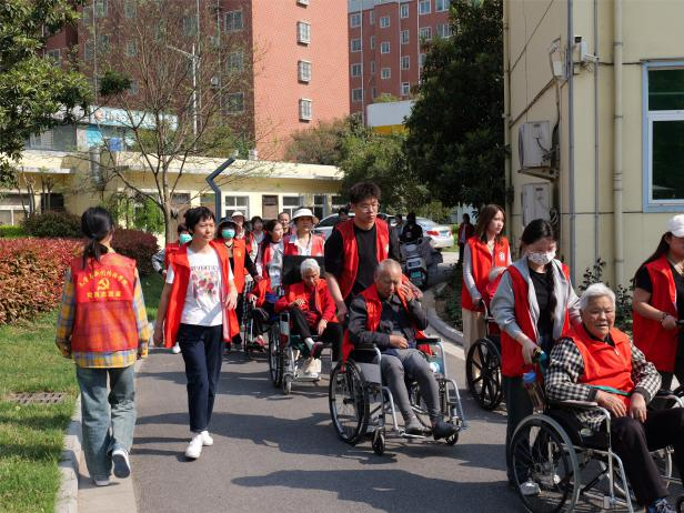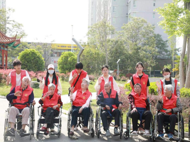 用青春搀扶夕阳,用爱拥抱世界。活动开始前,志愿者们将老人们推到残联公园,在春意盎然的风景中开展本次志愿活动。