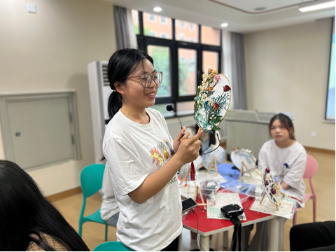 活动伊始,张老师就团扇的起源和历史发展过程向同学们进行了简要介绍,团扇是中国传统手工艺品,具有极高的艺术价值,凝结了中国传统文化内涵,象征幸福美好之意。接着,张老师讲解了团扇的制作方法。在张老师的引导下,同学们纷纷结合自身兴趣,发挥自己的创造力和想象力进行创作。或将画笔色彩巧妙地融合在一起,勾勒出自己独一无二创作画像;或巧手生花,赋予一朵朵干花全新的“生命”,为团扇增添“鲜活”的艺术气息。活动结束后,张老师邀请同学们互相交流心得,分享收获,探讨技巧,整场活动氛围融洽,充满着欢声笑语。
