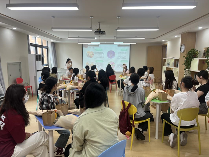 活动共分为暖场活动、花艺理论知识教授、自由创作和交流分享四个环节。活动伊始,通过破冰游戏“大风吹”使同学们在轻松愉快的氛围中相互熟悉,建立起初步的信任与友谊。随后,姬老师细心向同学们教授花艺制作的相关知识,如:花艺基本理论、插花技巧、插花的类型、插花的工具等,希望同学们能够按照自身的喜好去创作属于自己的独特花艺作品,轻松享受花艺作品的创设给自身带来愉悦心理体验。接着,正式进入插花环节,同学们根据花艺设计理论知识和自己的喜好,选择自己喜爱的花叶作为创作基本素材,在花篮中呈现自己的构思。插花作品完成后,姬老师引导大家对自己的作品进行介绍和分享。