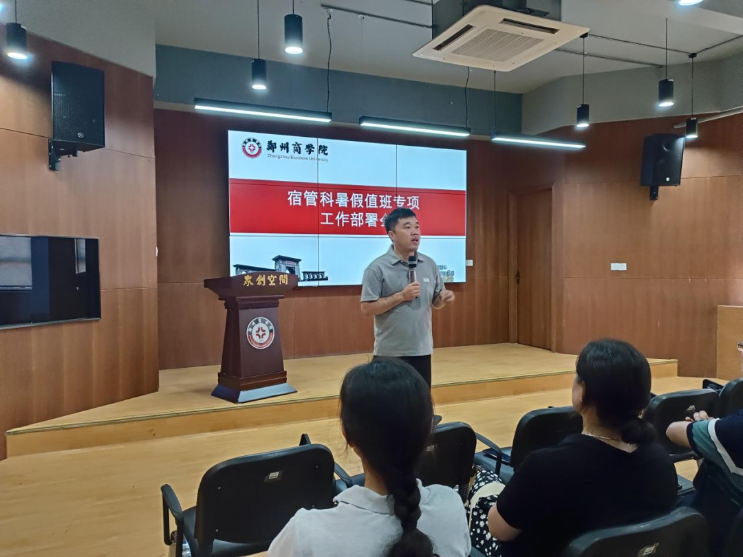 为扎实做好假期留校学生的管理服务,有效保证考研学子安全舒适的宿舍环境,筑牢校园安全稳定防线,学务处宿管科于7月2日上午在学生事务中心三楼路演厅召开了暑假值班专项工作部署会议,宿管科全体人员参加此次会议,会议由宿管科科长贺萌主持。