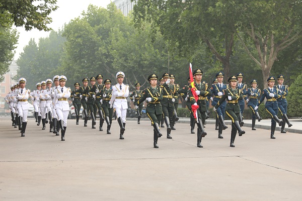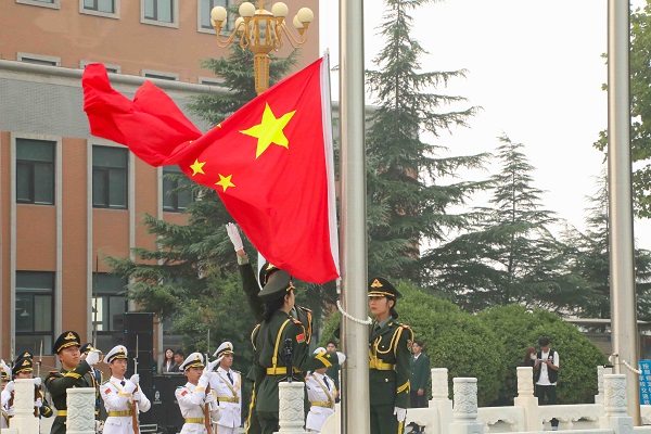 旭日东升,朝阳灿烂。晨光中的中心广场庄严肃穆,国旗护卫队迈着整齐划一的步伐,昂首阔步护送五星红旗走向升旗台。在庄严的国歌声中,鲜艳夺目的五星红旗冉冉升起,迎风飘扬。全体师生着装整齐、列队有序,面向国旗行注目礼、唱响国歌。