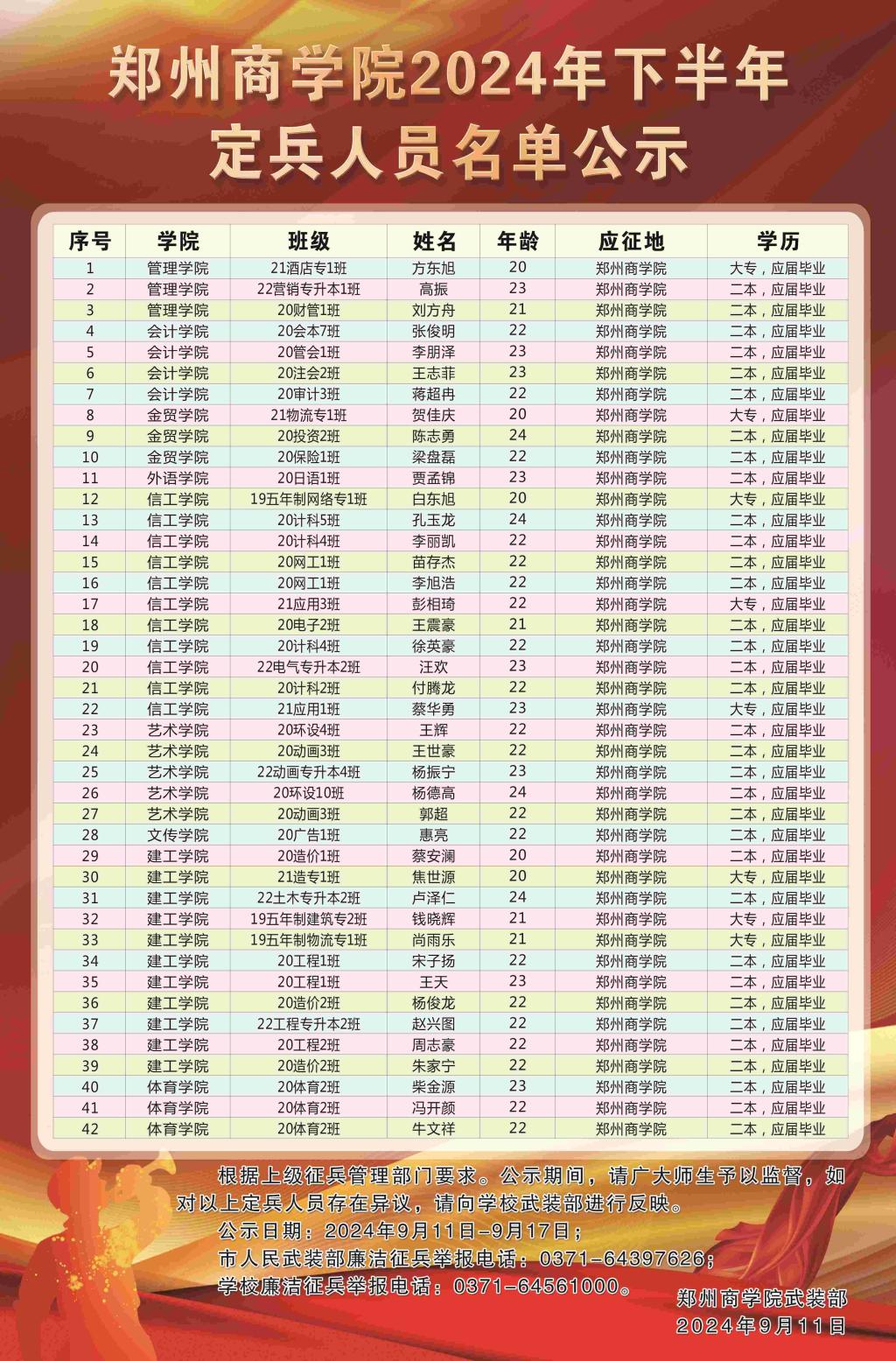 经过“网上报名、体格检查、心理测试、政治考核、役前教育”等环节,巩义市征兵工作领导小组定兵会议研究通过,确定威尼斯官网方东旭等42名学生为2024年下半年应征入伍定兵对象,现根据相关规定予以公示,人员名单如下: